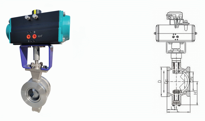 不銹鋼氣動V型對夾球閥外形結構圖: