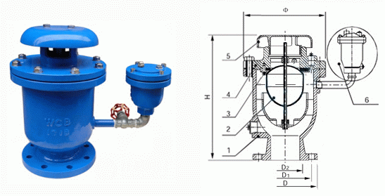復(fù)合式高速進(jìn)排氣閥是一直由閥體、浮球、大孔密封組件、閥蓋、排氣罩、小孔排氣閥以及檢修閥等主要部件組成的法蘭連接的分分體式排氣閥。其具有當(dāng)首次供水或因維修處于空管充水時(shí),能快速排盡管內(nèi)空氣并將水注滿,或在運(yùn)行中因水中析出的空氣形成壓力氣囊產(chǎn)生氣阻時(shí),小排氣孔將自動(dòng)開啟排氣,杜絕管中因壓力氣囊阻礙水的流動(dòng),有效提高注水或輸水效率。