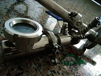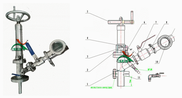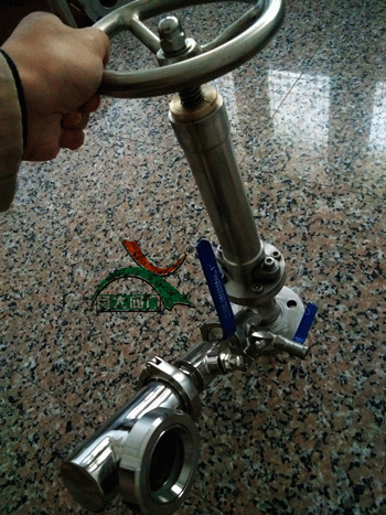 4、排氣口式真空取樣閥進出口為60度閥,形態(tài)如“Y”字。通??煞QY型閥或角閥,也可屬于角閥中的一種特殊閥。此閥通常進口為外絲,出口為內(nèi)絲。但此閥采用進口法蘭式,出口卡箍連接方式。出口配衛(wèi)生級球閥及視鏡容器。精小形閥閥柱采用兩段T型槽連接,閥柱螺紋部與閥柱螺母相配,閥柱螺母靠螺紋旋緊在閥蓋上,然后用銷釘固定。閥桿和手輪連接,然后用螺母壓緊,這樣旋轉(zhuǎn)手輪就可以開啟或關(guān)閉閥門。