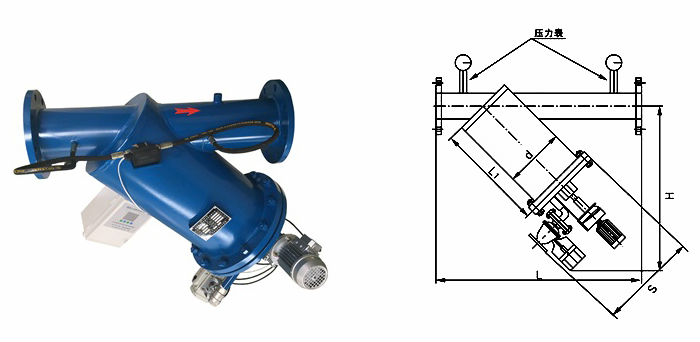 Y型電動刷式過濾器主要由殼體、法蘭、法蘭蓋、濾筒濾網(wǎng)、壓差開關(guān)、清洗電機、控制箱、電動排污閥、清洗刷及內(nèi)部傳動機構(gòu)等部件組成,其當(dāng)進出口的壓差達到預(yù)設(shè)值或到達清洗時間、手動預(yù)制時,將開始自動清洗過程,整個自清洗過程包含兩個步驟:首先打開位于過濾器上的電動排污閥,然后電機帶動濾網(wǎng)內(nèi)的清洗系統(tǒng),被濾網(wǎng)所攔截下來的雜質(zhì)從排污閥排出。整個清洗過程耗時可根據(jù)用戶要求設(shè)定,清洗時系統(tǒng)不斷流。
