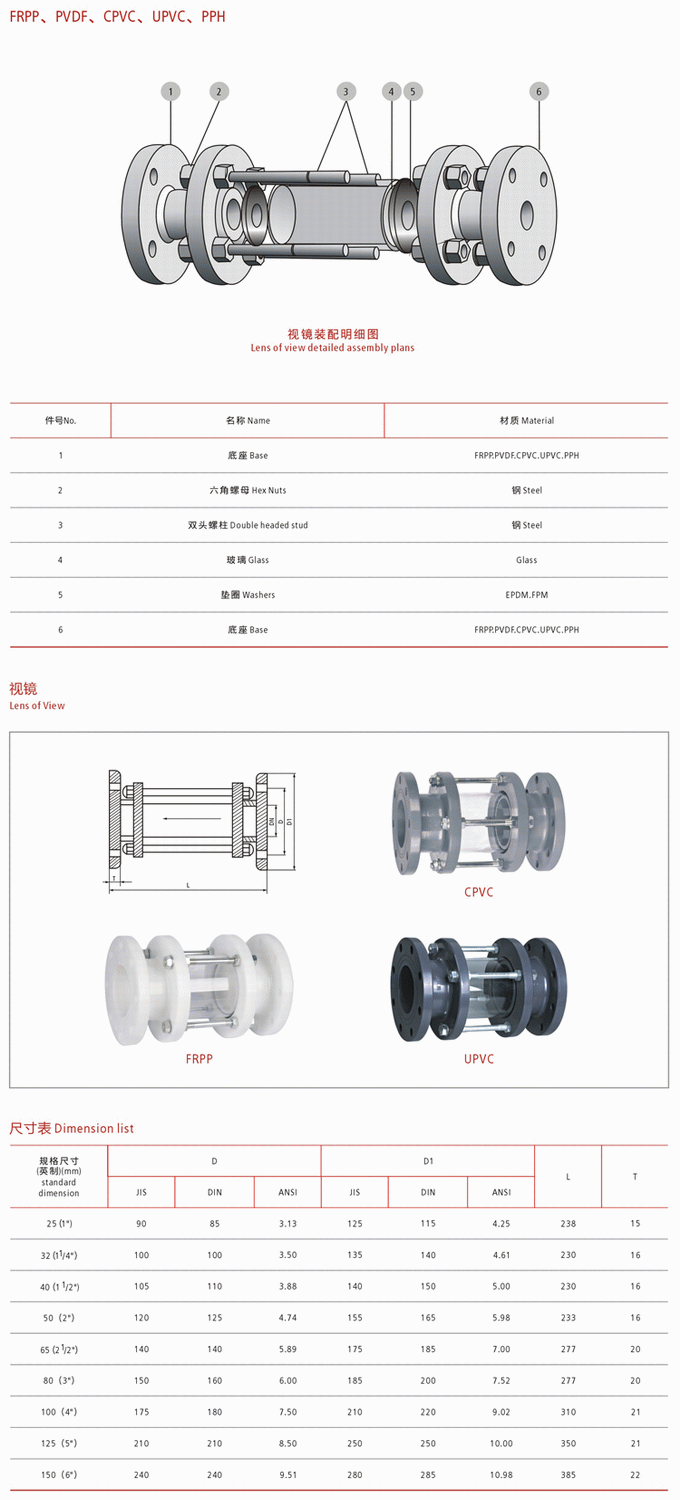 RPP,PPH,PVC塑料視鏡也叫做玻璃管視鏡或稱視盅,是安裝在管道或設(shè)備上可以隨時查看監(jiān)測內(nèi)部物料的工作情況。同時視鏡采用鋼化硼硅玻璃,聚乙烯四氟墊片,適用于大部分惡劣的工作環(huán)境中,并且使用壽命較長。是工業(yè)管道裝置上主要附件之一,在石油、化工、醫(yī)藥、食品等工業(yè)生產(chǎn)裝置的管道中,視盅能隨時觀察管道中液體、氣體、蒸汽等介質(zhì)流動及反應(yīng)情況,起到監(jiān)視生產(chǎn)、避免生產(chǎn)過程中事故發(fā)生的作用。視盅由于結(jié)構(gòu)緊湊,它安裝簡單,使用方便,非常容易清洗與維修,是目前最常用的一種產(chǎn)品。