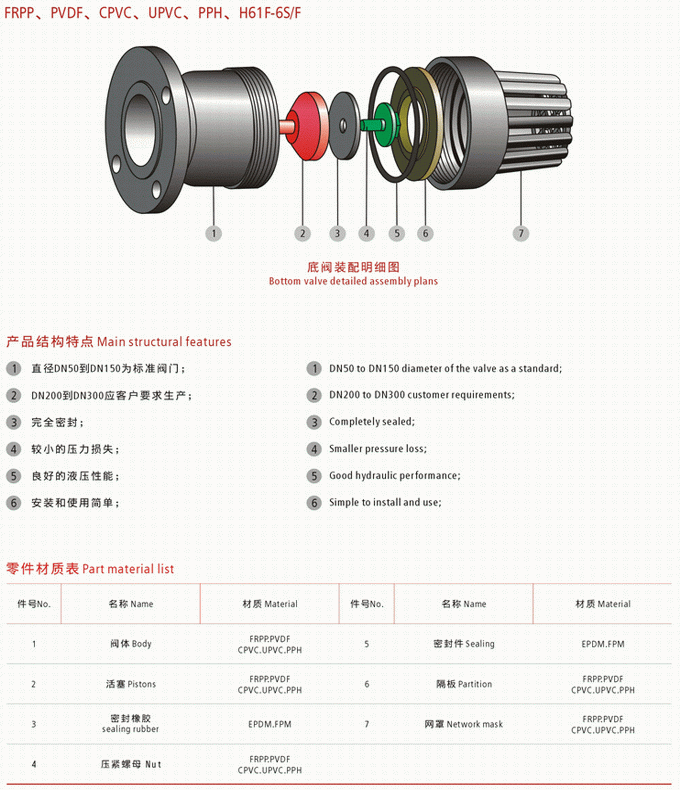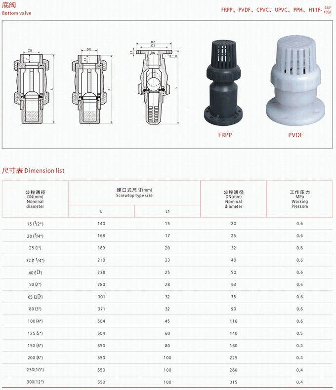 塑料底閥是一種節(jié)約能源的閥,一般安裝在水泵水下吸管的底端,限制水泵管內(nèi)液體返回水源,起著只進不出的功能。閥蓋上有很多個進水口和加強筋,起到了不易堵塞,主要應(yīng)用在抽水的管路上。水道和支承的作用.口徑有單瓣、雙瓣、多瓣型,有法蘭連接和螺紋連接。塑料底閥由閥體、閥蓋、閥瓣、密封圈和墊片等部件組成。底閥在接入管路后,液體介質(zhì)從閥蓋方向進入閥體,液體的壓力作用于閥瓣,使得閥瓣被打開允許介質(zhì)流過,當(dāng)閥體內(nèi)的介質(zhì)壓力變化或消失時,閥瓣關(guān)閉阻止介質(zhì)倒流。塑料底閥零件材質(zhì)表: