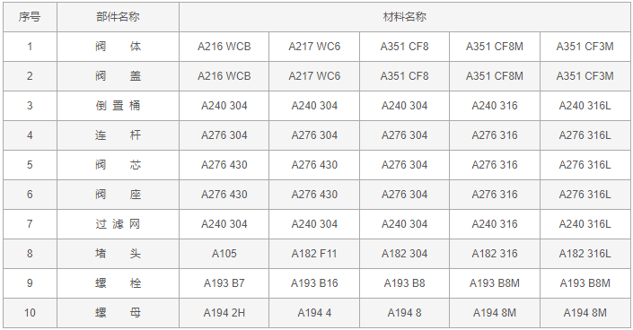 992、882F倒置桶式蒸汽疏水閥零件材料: