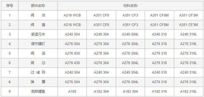 可調(diào)恒溫式蒸汽疏水閥零件材料: