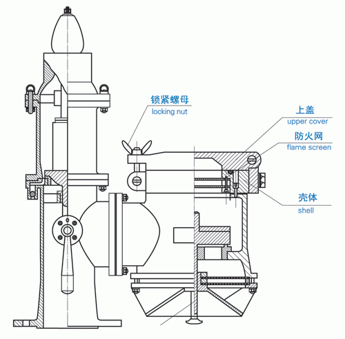 當貨油艙的透氣系統(tǒng)裝設(shè)了符合規(guī)定的高速透氣閥后,艙內(nèi)的驅(qū)氣,只要艙內(nèi)壓力達到高速透氣閥的設(shè)定開啟壓力,壓力閥就會自動開啟,以大于30m/s的速度向甲板上空排出。但貨油艙的其他作業(yè)工況,比如清洗、除氣,也需要透氣,或隨時需要將艙內(nèi)和大氣連在一起時,此時艙內(nèi)壓力或無壓而不能打開壓力閥(注:壓力閥是不能在手動打開,而出口流速不小于30m/s的情況下工作的),就需要一個能手動開啟的透氣裝置,該裝置即為驅(qū)氣蓋。依據(jù)MSC/Circ.677中的相關(guān)要求,驅(qū)氣蓋并具有壓力/真空閥的等同要求,應(yīng)能阻止火焰進入貨油艙。因此,配有驅(qū)氣蓋的高速透氣閥,不管是壓力閥還是真空閥出現(xiàn)故障時,只要打開驅(qū)氣蓋進行透氣。