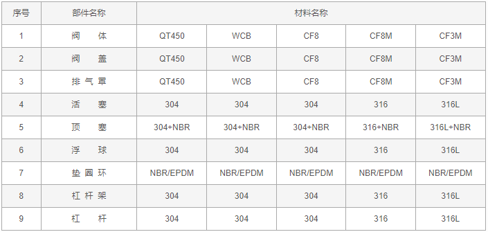 污水高速排氣閥零件材料: