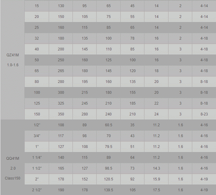 法蘭高溫球閥外形尺寸表: