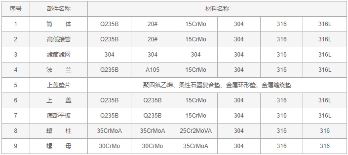高低接管籃式過濾器零件材料: