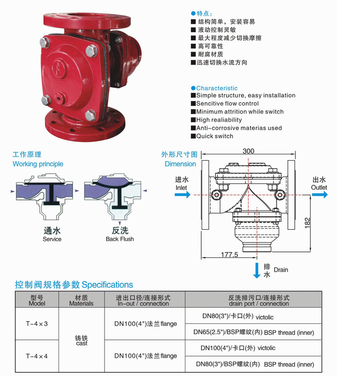 二位三通閥應(yīng)用于至少有兩個(gè)并列過濾單元的自動(dòng)反沖洗過濾系統(tǒng),即:在反沖洗過程中,經(jīng)一個(gè)過濾單元過濾后的潔凈水作為另外一個(gè)過濾單元的沖洗水。當(dāng)接受到控制器發(fā)出的水力信號(hào)后,反沖洗閥內(nèi)改變水流的流向:關(guān)閉進(jìn)水口,打開排水口,經(jīng)其它過濾單元過濾后的潔凈水進(jìn)入此單元進(jìn)行沖洗,并將沖洗水經(jīng)排放口排放。