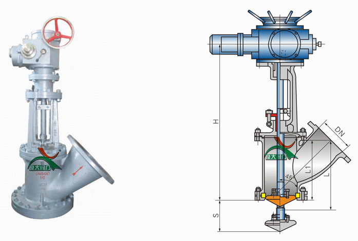 電動平底放料閥有Y型及角式兩種結(jié)構(gòu)形式,根據(jù)實際工況的需要,放料口的形式設(shè)計有帶管接及平底兩種,閥體內(nèi)腔裝有耐沖刷、耐腐蝕的護板,在開啟閥門瞬間,可以保護閥體不被介質(zhì)沖刷、腐蝕,并對其整體進行化學鍍Ni.P處理,使表面硬度達到HRC60—62,有耐磨、耐腐蝕的。閥座密封面與閥瓣密封面均堆焊有司太立硬質(zhì)合金,密封副采用線密封,保證密封,密封的可靠性,并可防止結(jié)疤。閥門設(shè)有防轉(zhuǎn)機構(gòu),保證閥桿在開啟和關(guān)閉時只做直線運動,不做回轉(zhuǎn)運動。該閥主要由閥體、閥瓣、密封圈、閥桿、支架、閥壓蓋、手輪、法蘭、螺母、定位螺釘?shù)攘慵M成。手輪順時針旋轉(zhuǎn),閥門關(guān)閉,閥桿向上移動,此閥為上展式。手輪順時針旋轉(zhuǎn),閥門關(guān)閉,閥桿向下轉(zhuǎn)動,此閥為下展式。閥門驅(qū)動方式有:手動、電動、氣動、齒輪傳動。