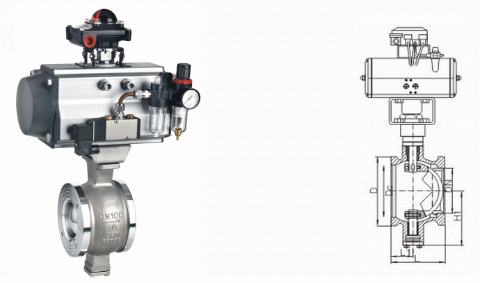 對夾式氣動V型切斷球閥外形結(jié)構(gòu)圖: