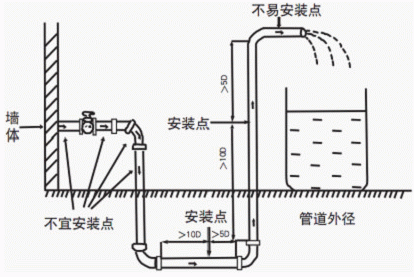 (2)安裝位置不要選在管道走向的最高點,防止管道內(nèi)因有氣泡聚集而造成測量不正常。