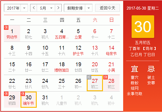 2017年端午節(jié)放假時(shí)間為:5月28日—5月30日,共3天。其中5月30日為法定節(jié)假日,5月31日(星期三)照常上班。請(qǐng)大家合理計(jì)劃時(shí)間,提高工作效率,落實(shí)好節(jié)前各項(xiàng)工作任務(wù)安排。 祝大家端午節(jié)快樂!
